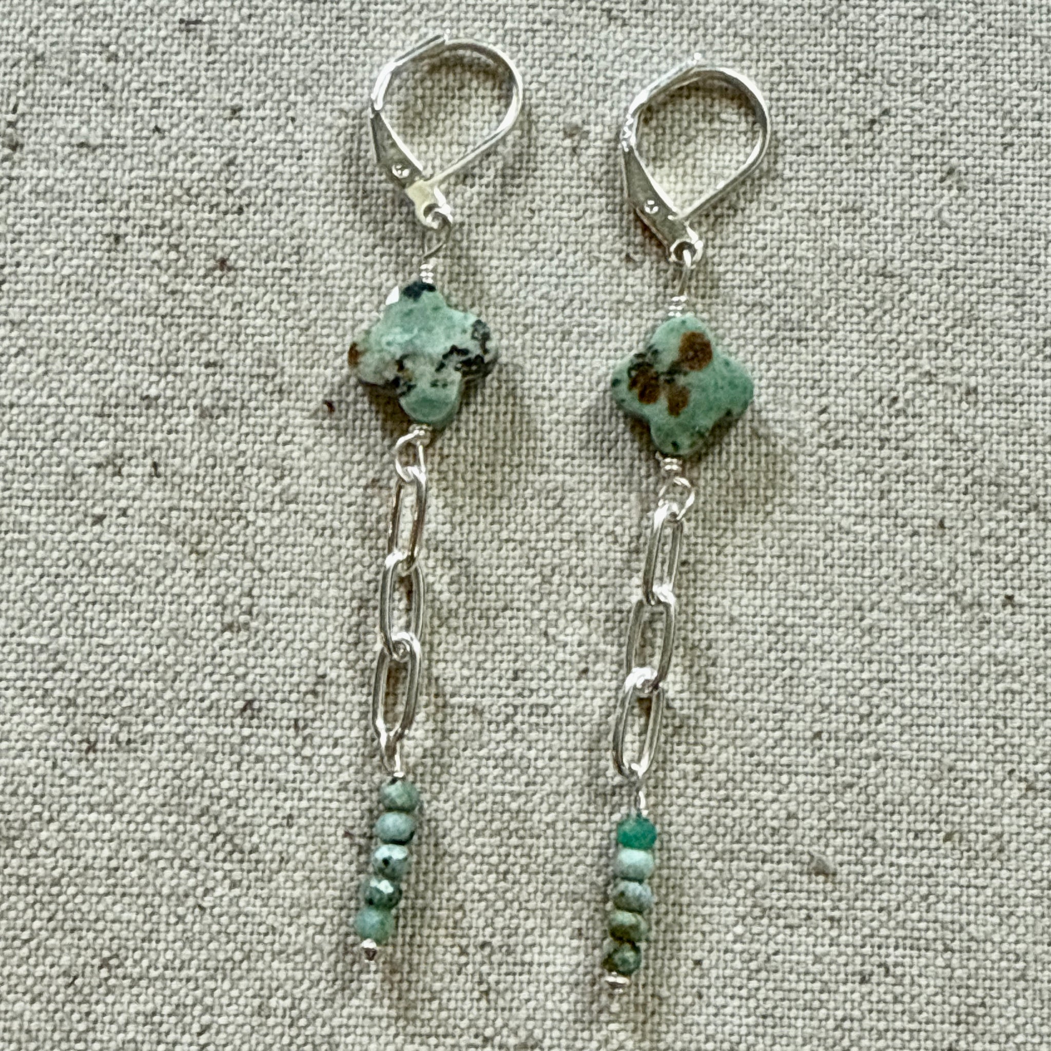 Shades of greens make up this gorgeous Turquoise pair of earrings. 1 1/2" in length. Super lightweight, sterling silver, lever back ear wires.