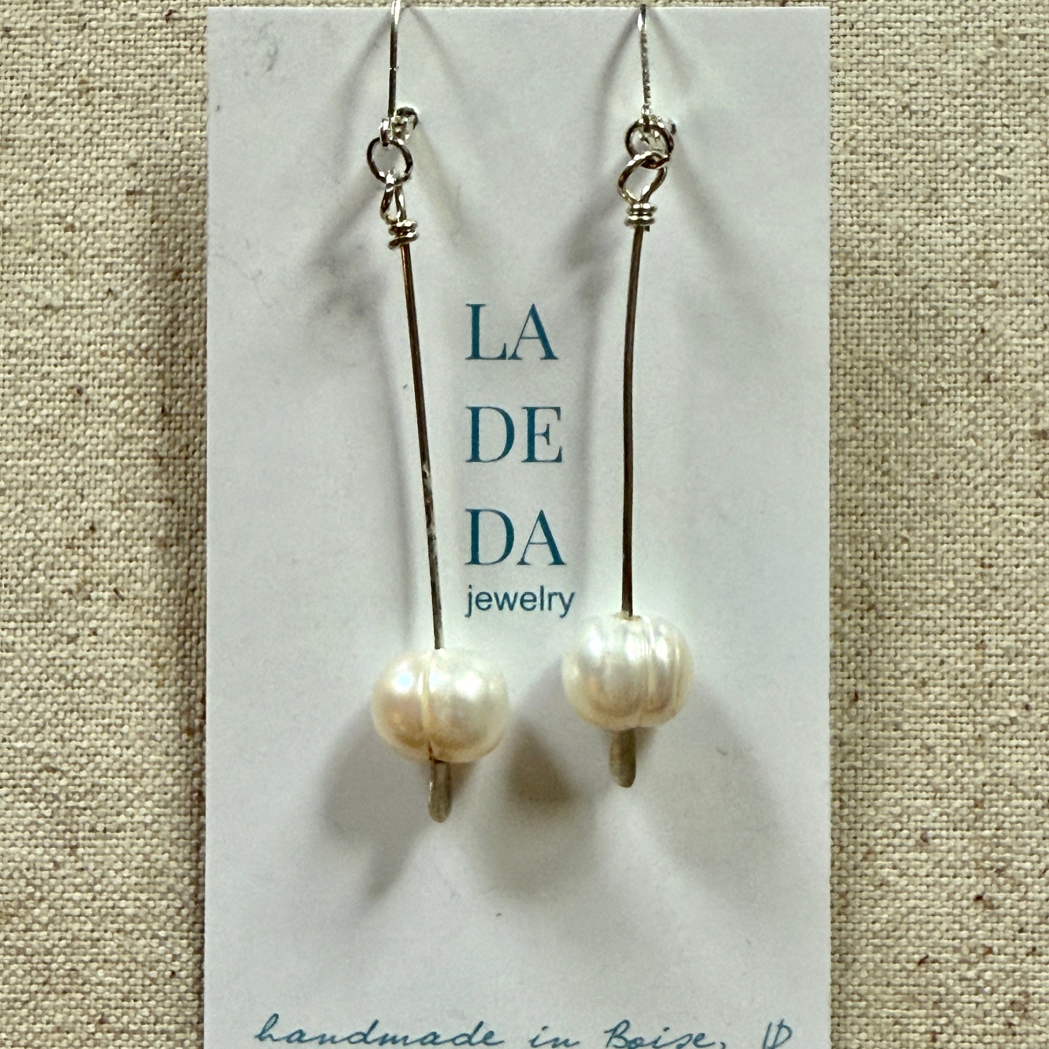 Pearl, always a classic, and we love classic, but why not add a bit of sass to a traditional stone?  That's what we like to do- so here you have it a modern twist on an old fave! 2" in length, sterling silver with lever back ear wires.